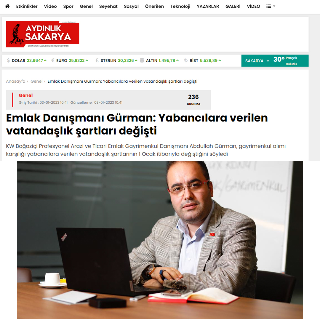 KW Boğaziçi Profesyonel Arazi ve Ticari Emlak Gayrimenkul Danışmanı Abdullah Gürman, gayrimenkul alımı karşılığı yabancılara verilen vatandaşlık şartlarının 1 Ocak itibarıyla değiştiğini söyledi.