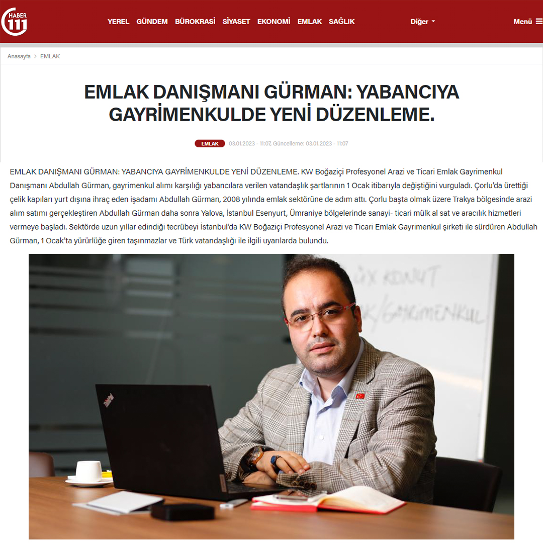EMLAK DANIŞMANI GÜRMAN: YABANCIYA GAYRİMENKULDE YENİ DÜZENLEME. KW Boğaziçi Profesyonel Arazi ve Ticari Emlak Gayrimenkul Danışmanı Abdullah Gürman, gayrimenkul alımı karşılığı yabancılara verilen vatandaşlık şartlarının 1 Ocak itibarıyla değiştiğini vurguladı.